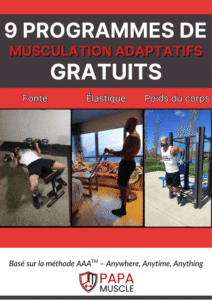 La plupart des programmes de musculation sur internet sont rigides. Si tu n’as pas de banc de musculation, tu es bloqué. Si tu n’as pas 1h30 devant toi, tu abandonnes. Avec la Méthode AAA™ (Anywhere, Anytime, Anything), tu deviens libre. Ce PDF gratuit contient 9 programmes complets adaptés à ta réalité :